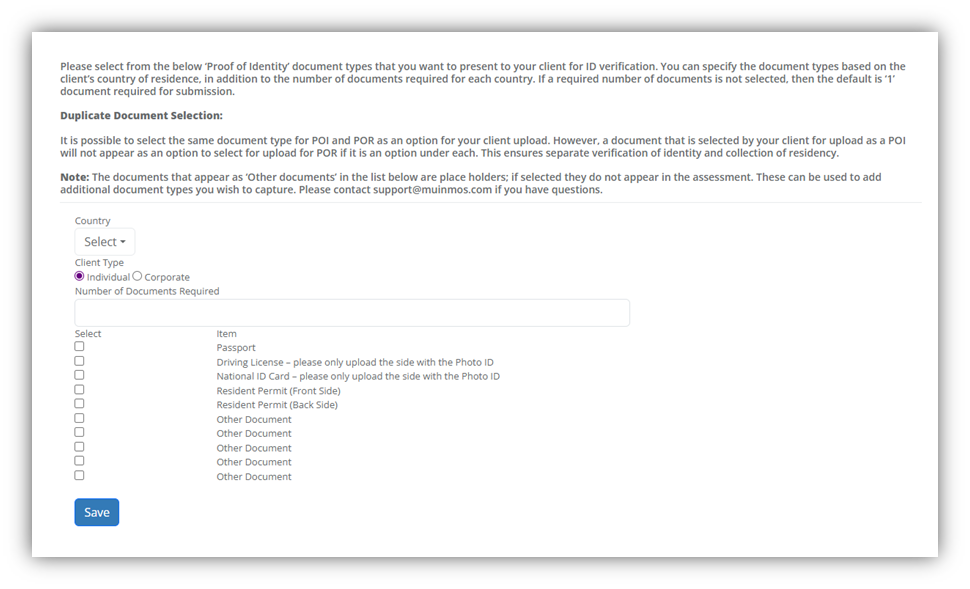 Please note that these changes are made on a country-by-country basis. If you wish to make the acceptable documents universal, please contact care@muinmos.com and we will assist.