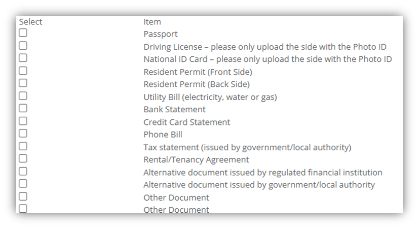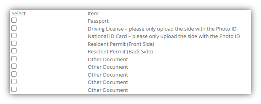When requesting Proof of Identity documents, you can customise the types of documents that you will accept on a per-country basis.