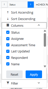 To customise which columns appear in the Assessment List, first click the three dots next to any column name. This will reveal a drop-down menu: