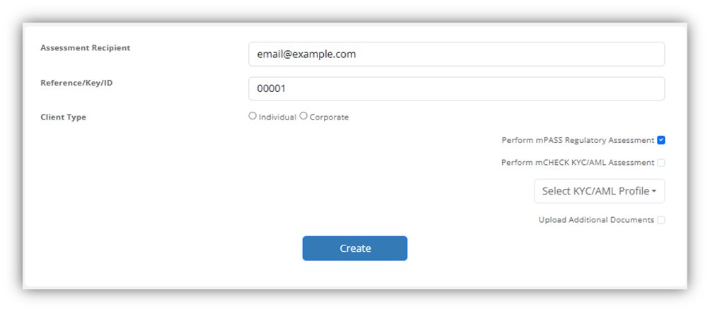 Select KYC/AML Profile: This dropdown reveals the available KYC Profiles for your Environment. The KYC Profile determines the KYC/AML checks that are performed by the system in the course of an assessment.